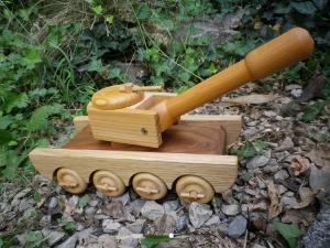 Ce véhicule en bois est un modèle de char d'assaut avec une tourelle mobile montée d'un canon orientable. Article artisanal fabriqué en bois massif (chataîgnier, ormeau, merisier, cèdre, hêtre)